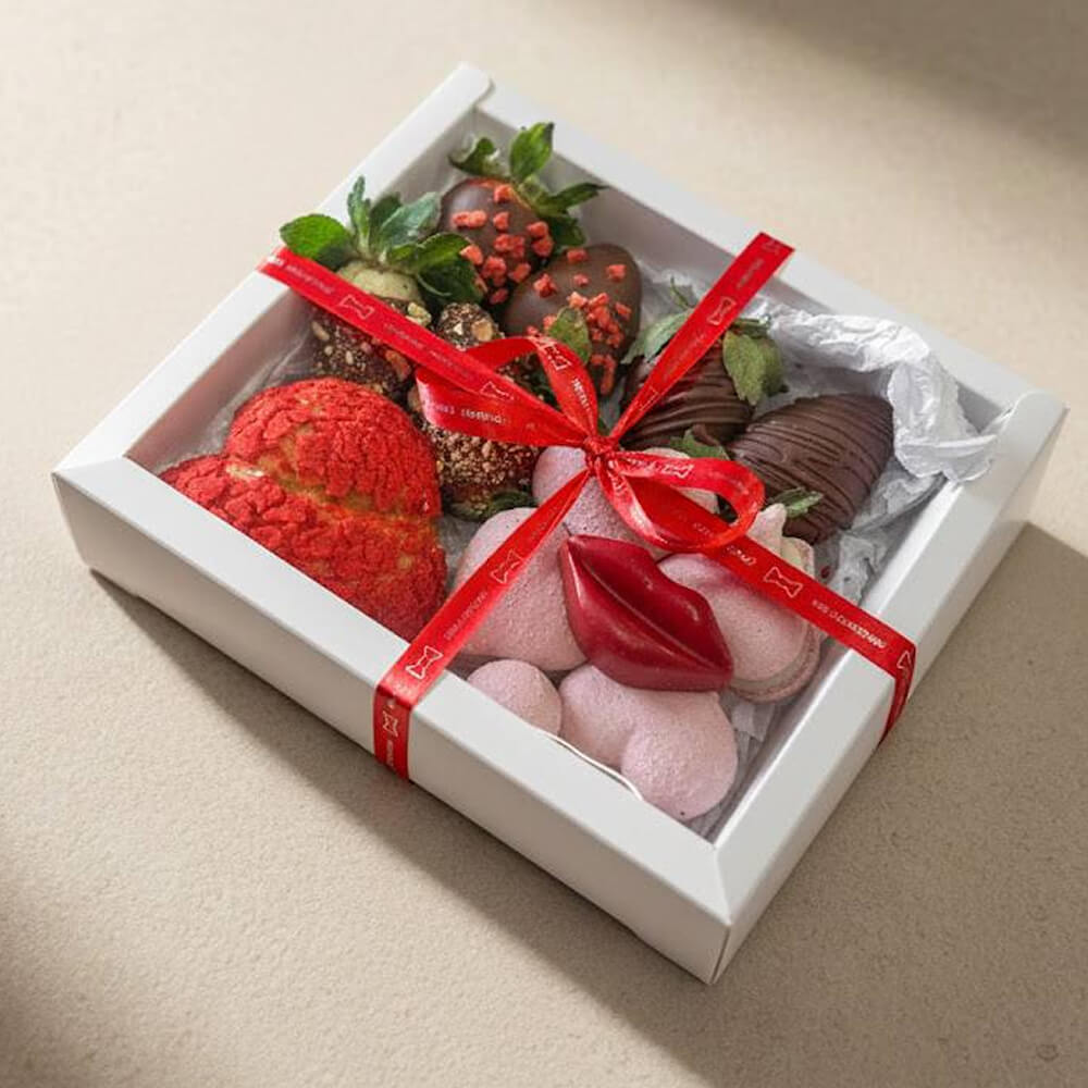 Клубника свежая, молочный шоколад (какао тертое, какао масло, сахар тростниковый, кешью, кокосовая мука, соль), фисташка, клубника сублимированная.